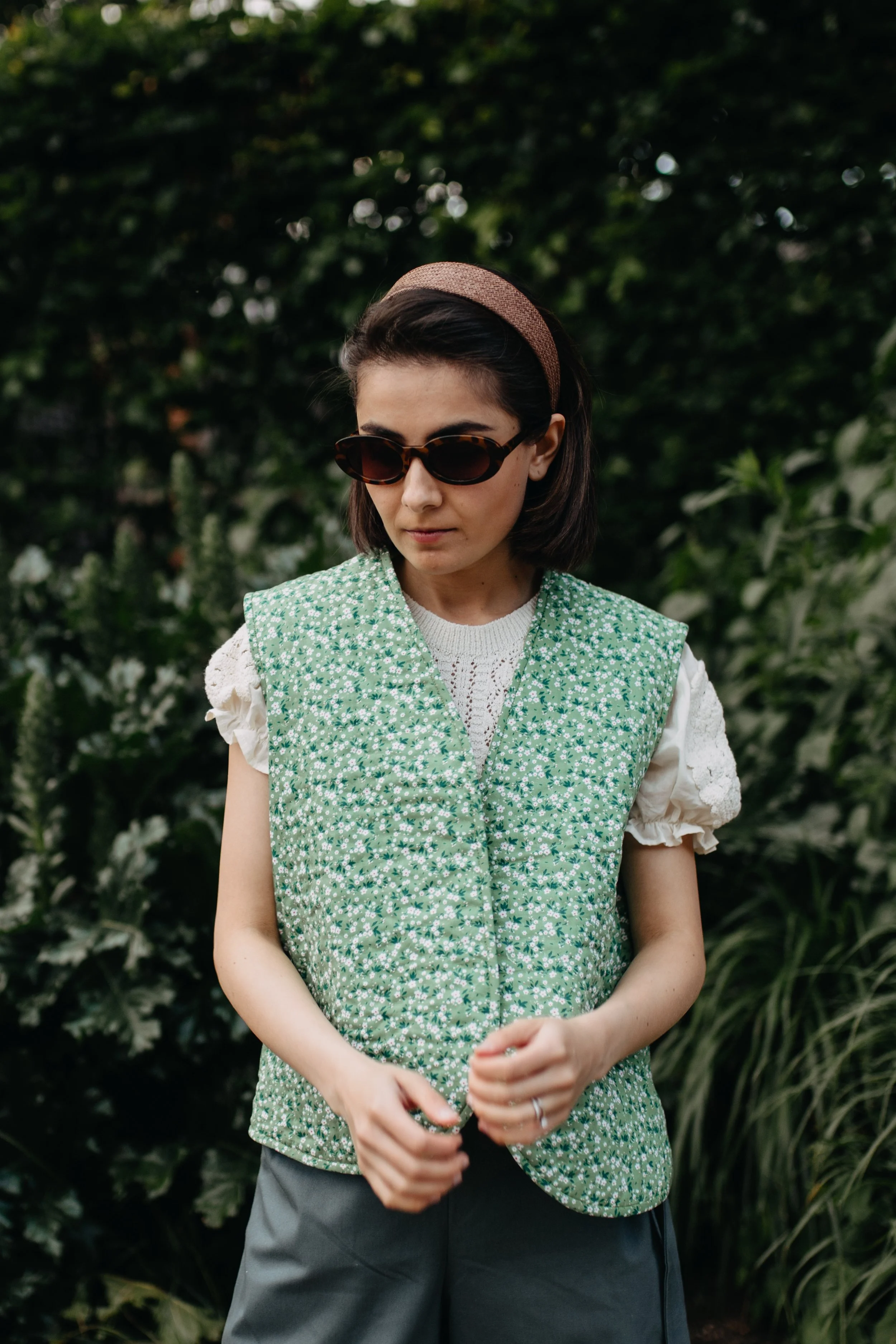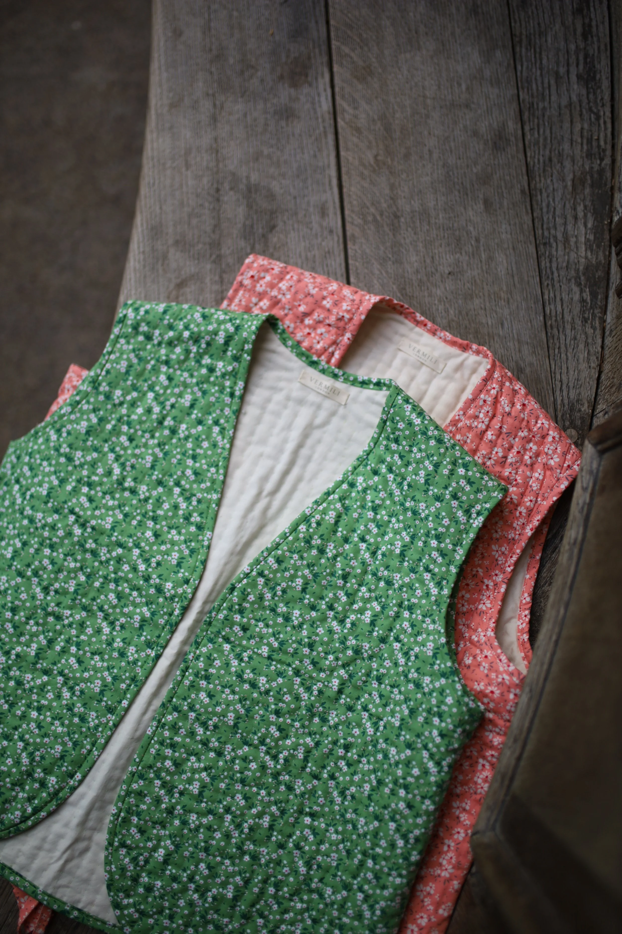 Hand-quilted beige vest, featuring a delicate white daisy pattern, filled with pure Uzbek cotton for best quality.